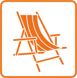 Piaszczysta plaża z przyjaznym dzieciom bezpiecznym wejściem do jeziora z leżakami, hamakami i leżankami.