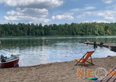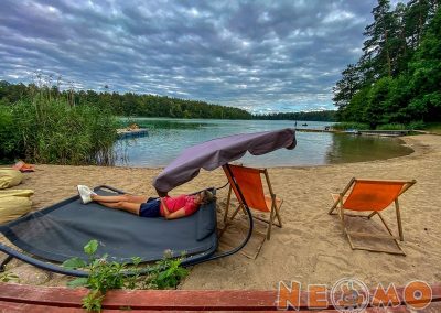 Piaszczysta plaża z przyjaznym dzieciom bezpiecznym wejściem do jeziora z leżakami, hamakami i leżankami.